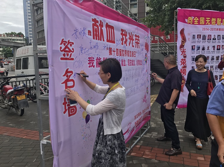 现场摆有“我献血,我光荣”的签名墙供大家签名留念,还展示出2014-2015年度全国无偿献血获奖名单。记者获悉,无偿献血已纳入精神文明建设之一,妇幼保健工作人员、无偿献血志愿者协会成员都积极参与到此次无偿献血活动中。